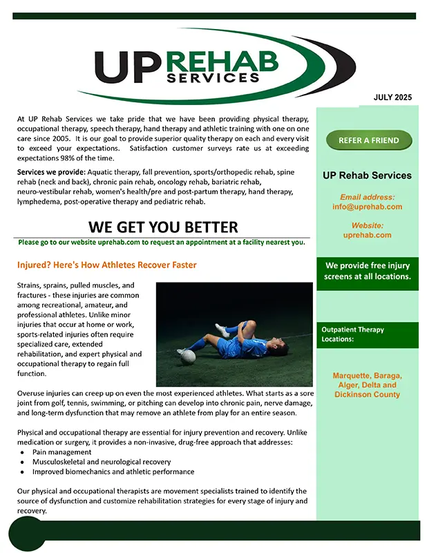 Click here to download our full newsletter Injured? Here’s How Athletes Recover Faster Strains, sprains, pulled muscles, and fractures – these injuries are common among recreational, amateur, and professional athletes. Unlike minor injuries that occur at home or work, sports-related injuries often require specialized care, extended rehabilitation, and expert physical and occupational therapy to regain full function. Overuse injuries can creep up on even the most experienced athletes. What starts as a sore joint […]