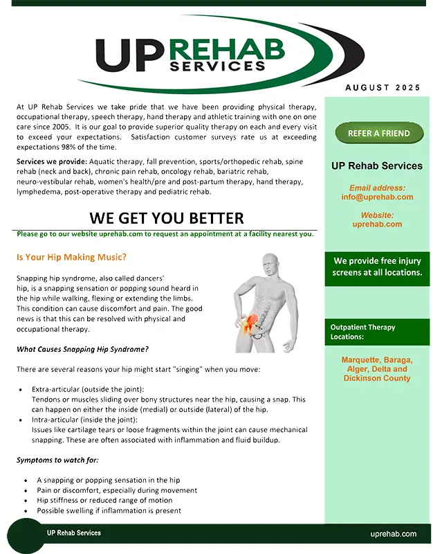 Click here to download our full newsletter Is Your Hip Making Music? Snapping hip syndrome, also called dancers’ hip, is a snapping sensation or popping sound heard in the hip while walking, flexing or extending the limbs. This condition can cause discomfort and pain. The good news is that this can be resolved with physical and occupational therapy. What Causes Snapping Hip Syndrome? There are several reasons your hip might start “singing” when you […]