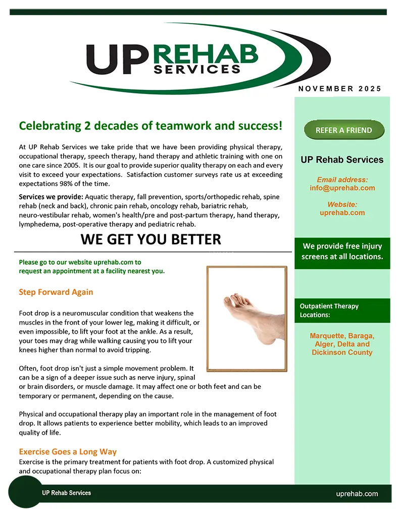 Click here to download our full newsletter Step Forward Again Foot drop is a neuromuscular condition that weakens the muscles in the front of your lower leg, making it difficult, or even impossible, to lift your foot at the ankle. As a result, your toes may drag while walking causing you to lift your knees higher than normal to avoid tripping Often, foot drop isn’t just a simple movement problem. It can be a […]